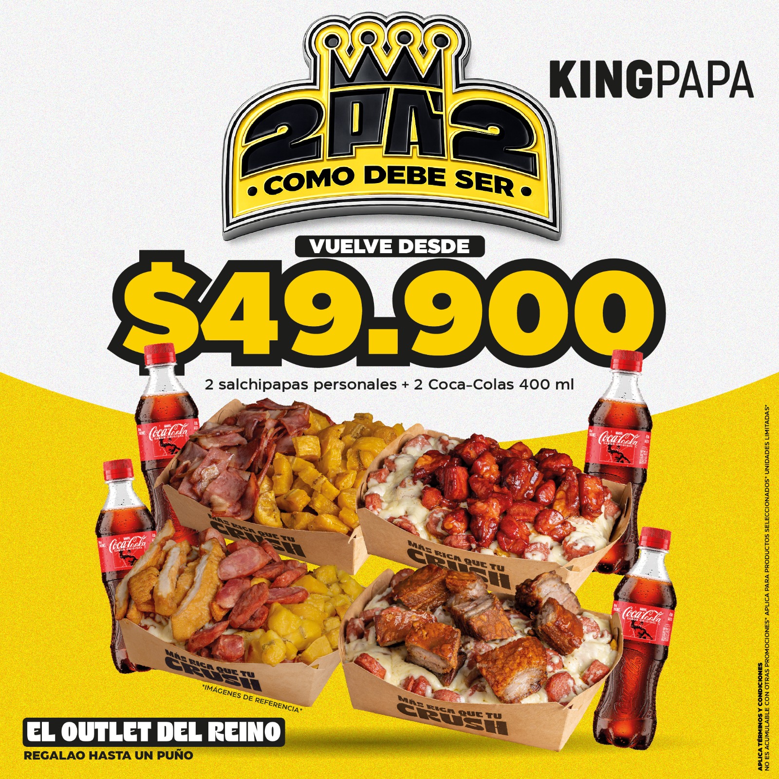 En KINGPAPA tiramos la casa por la ventana con una promo que está demasiado rota pa’ dejarla pasar: 2 salchipapas personales + 2 Coca-Colas por solo $49.900.